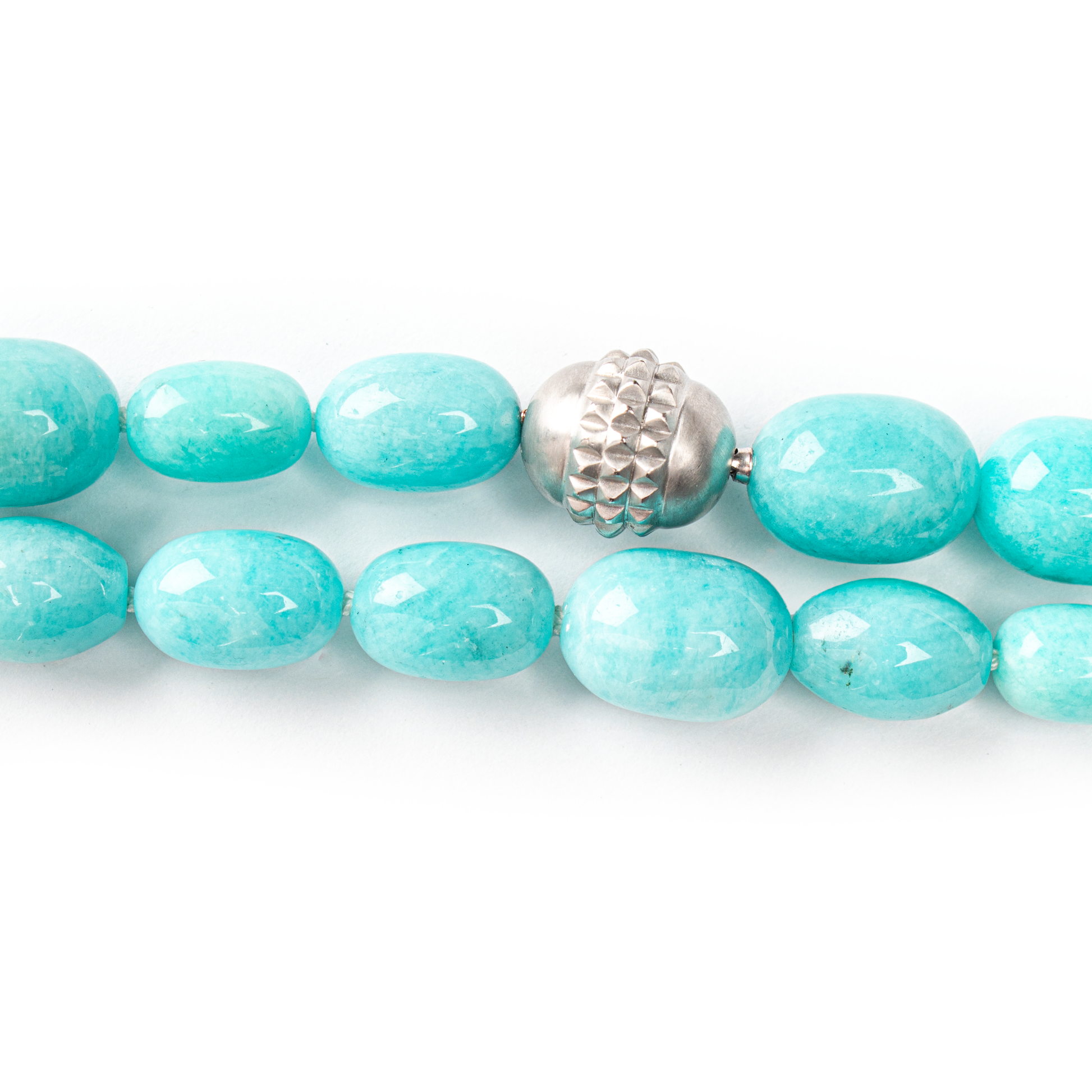 Collier aus blauem Amazonit mit drei Verschlüssen aus 18 kt Weissgold. Längen: 72,5 cm, 85 cm und 94 cm.