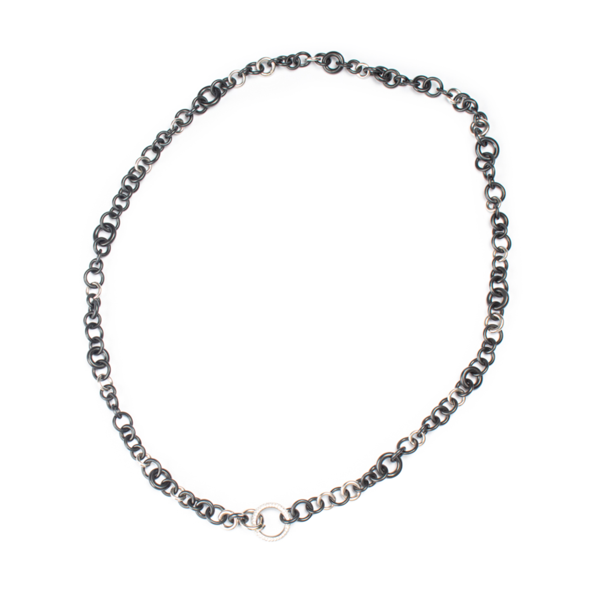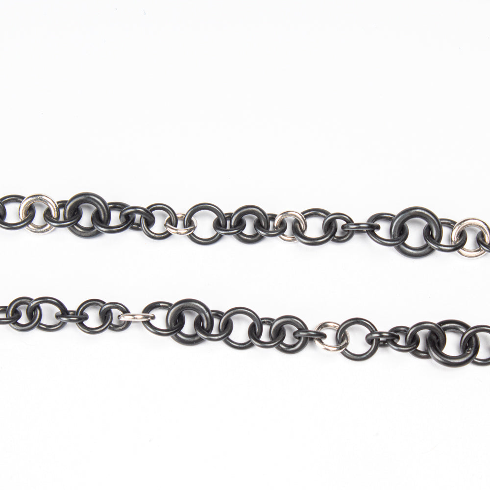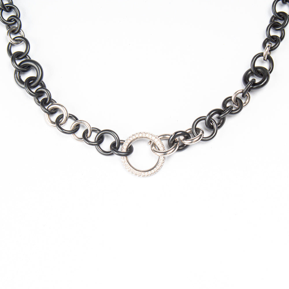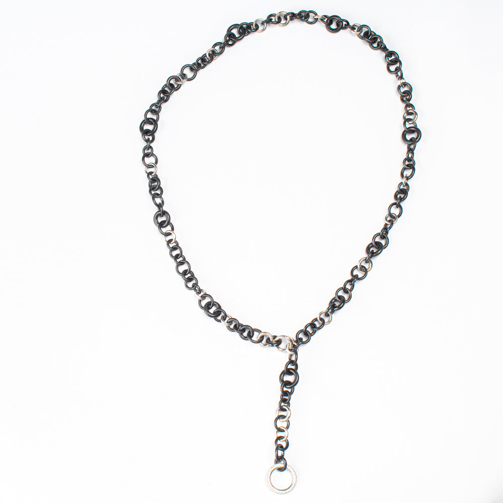 Ankerkette aus 950er Platin und brüniertem Stahl mit 144 Brillanten (F/G, vs) von insgesamt 0,70 ct. Länge 60 cm. Auf Wunsch auch in weiteren Längen erhältlich.