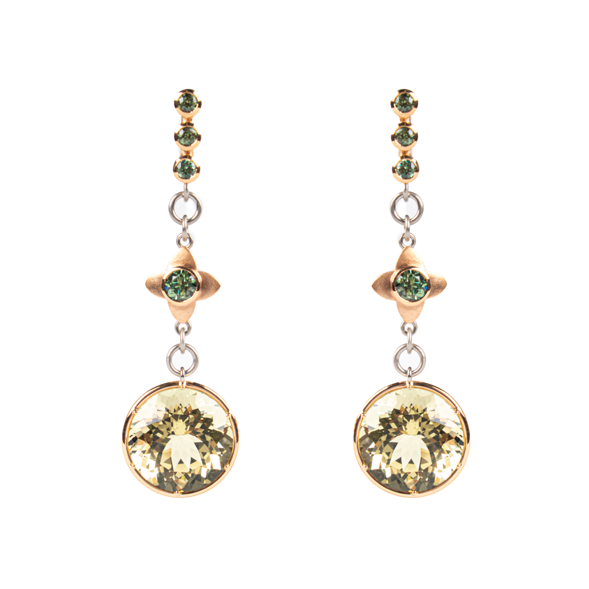 Ohrhänger aus 950er Platin und 18 kt Roségold mit zwei Goldberyllen von insgesamt 27,96 ct sowie acht Demantoide von insgesamt 1,97 ct.