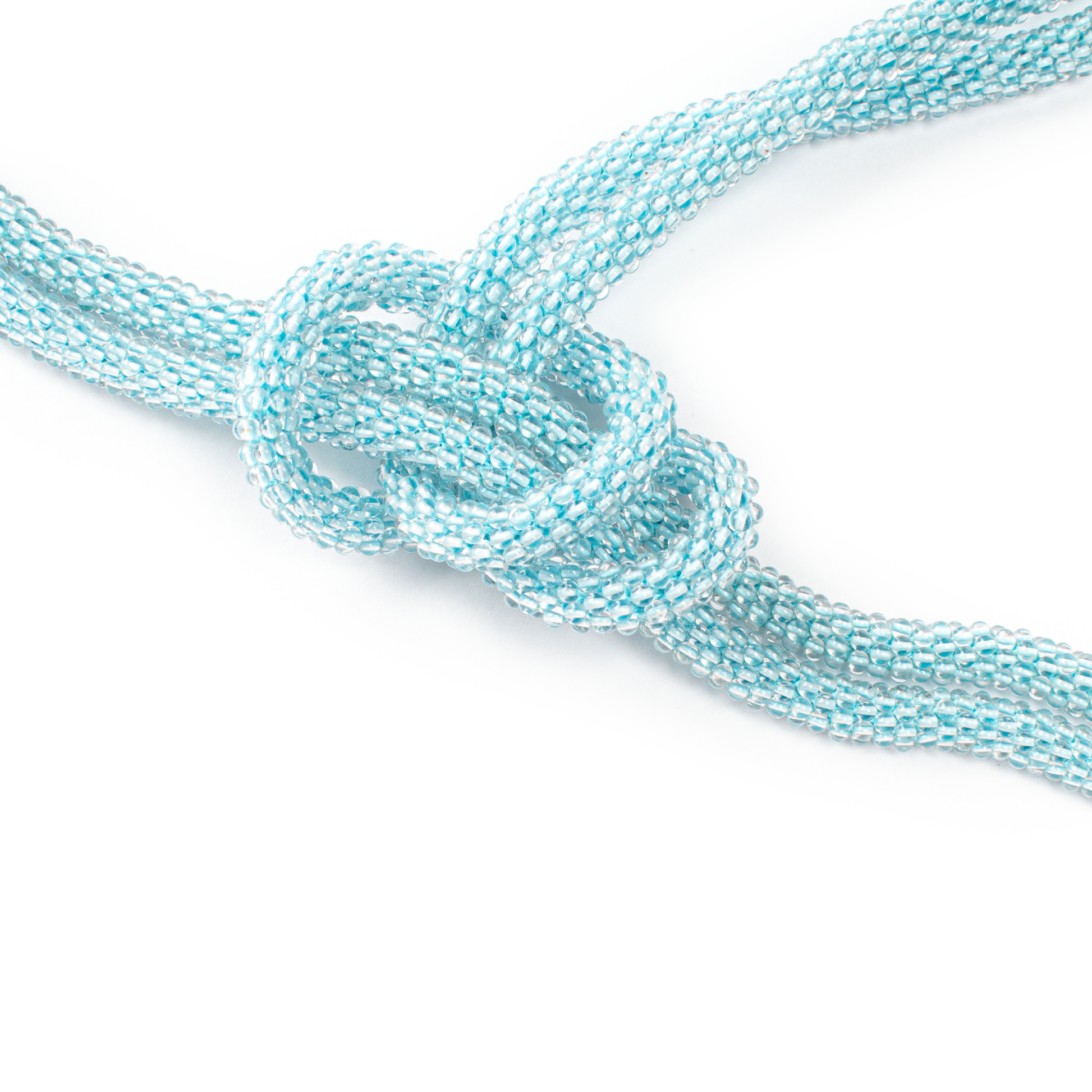 Collier aus 18 kt Weissgold und geschwärztem 925er Silber mit zwölf Paraiba-Turmalin-Cabochons in Navettenform von insgesamt 29,50 ct sowie 120 Brillanten (TW, vs) von insgesamt 1,76 ct. Ergänzt durch Bergkristallkügelchen auf türkisfarbenem Faden. Länge 222,5 cm. Einzelstück.