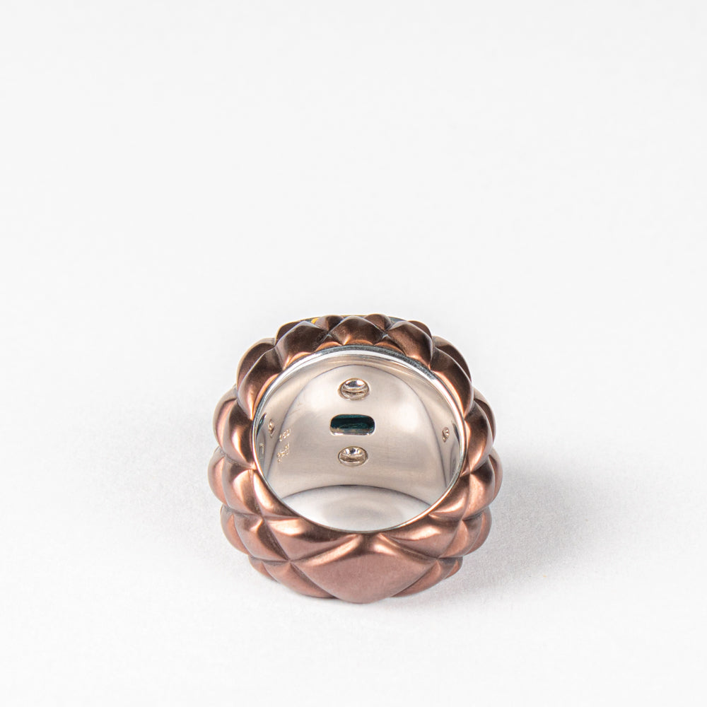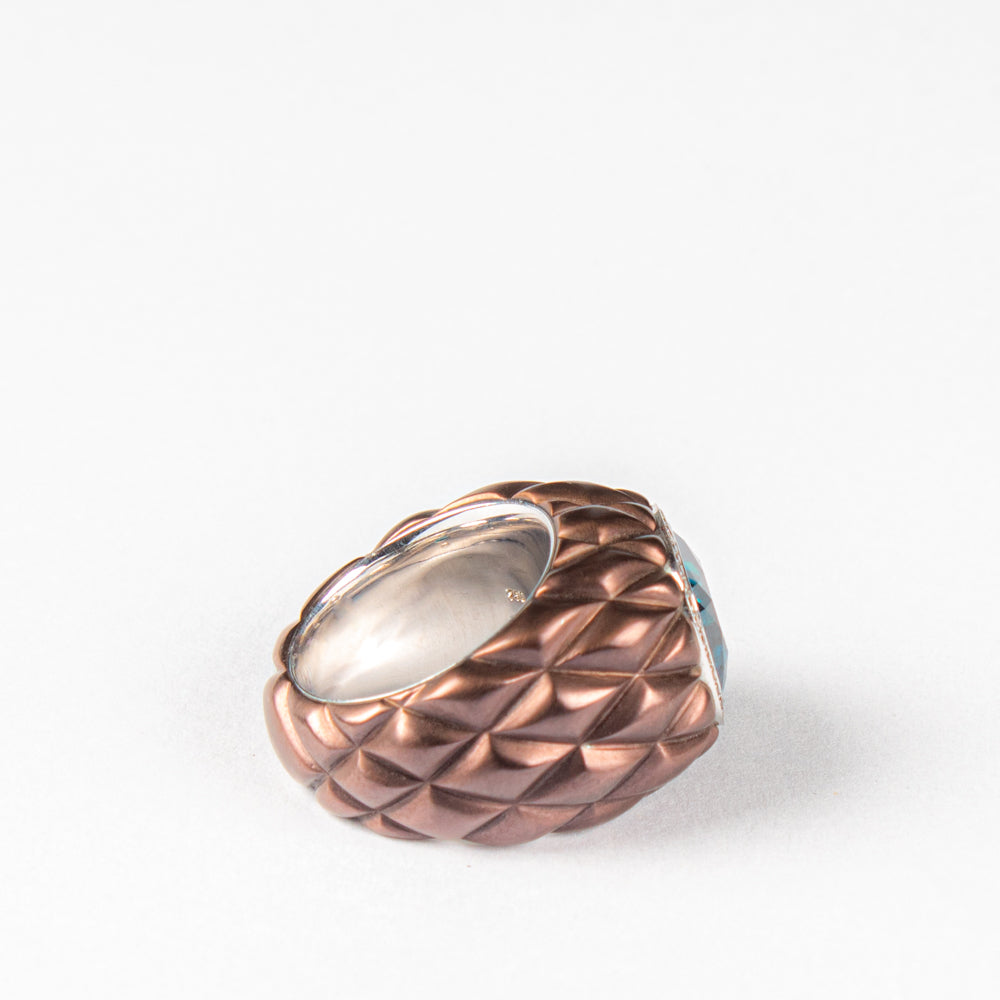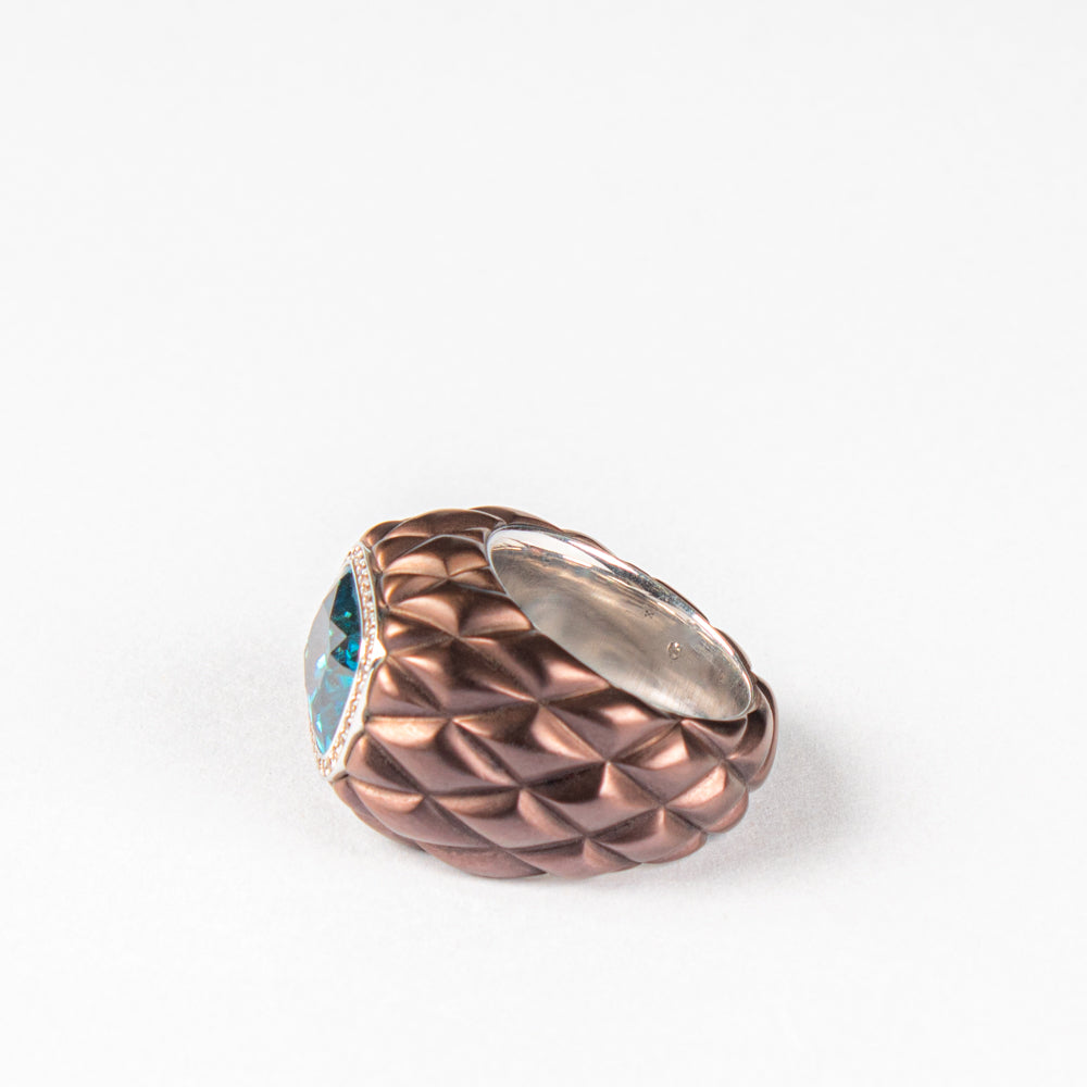 Ring aus Edelstahl und 18 kt Weißgold mit Keramikbeschichtung, besetzt mit einem antikeckigen blauen Zirkon von 11,19 ct sowie 34 braunen Brillanten von insgesamt 0,155 ct. Größe 54. Einzelstück.