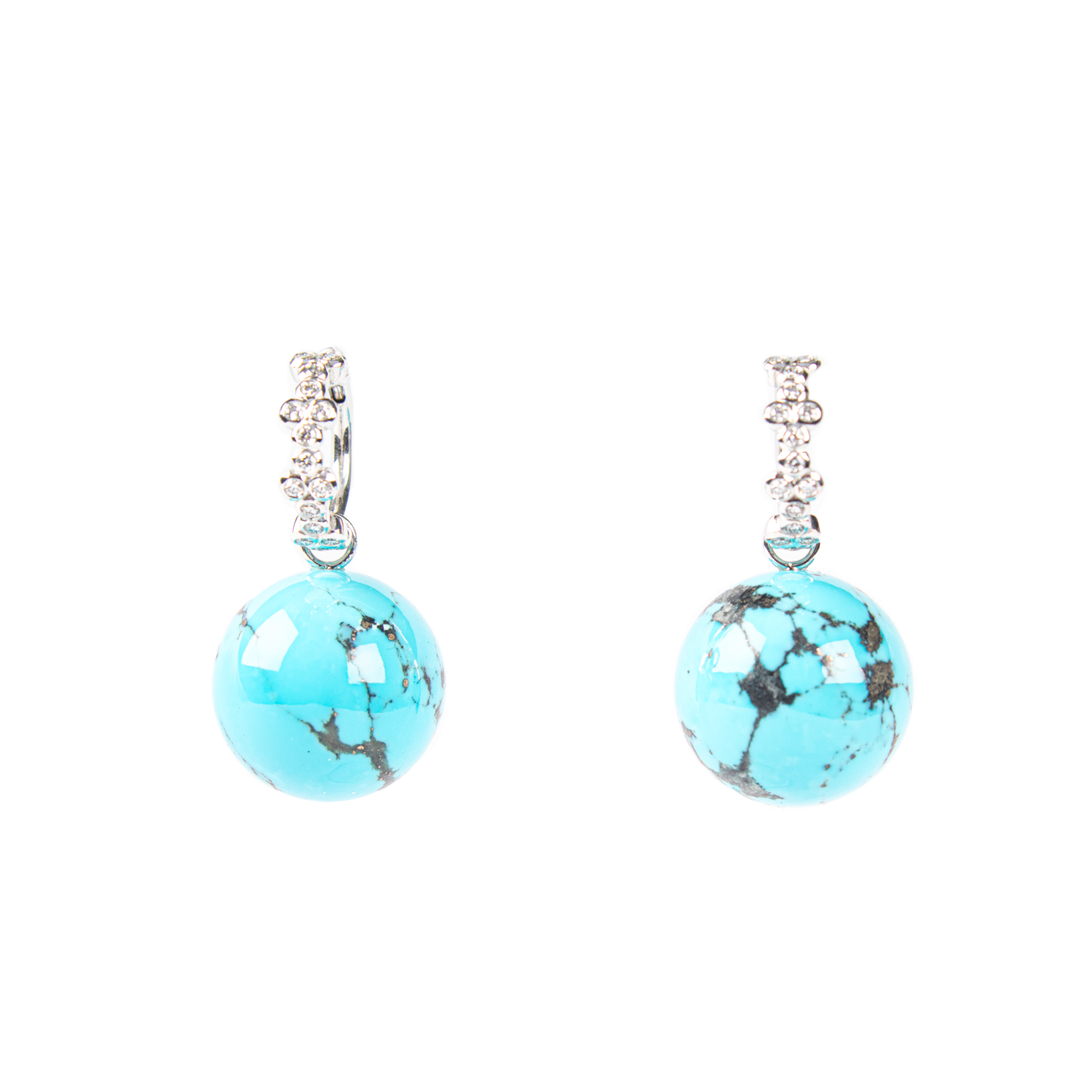 Creolen aus 18 kt Weissgold, 15 mm Durchmesser, mit 30 Brillanten (F/G, vvs) von insgesamt 0,34 ct und zwei marmorierten Türkiskugeln von 18 mm. Die Türkiskugeln können ein- und ausgehängt werden.