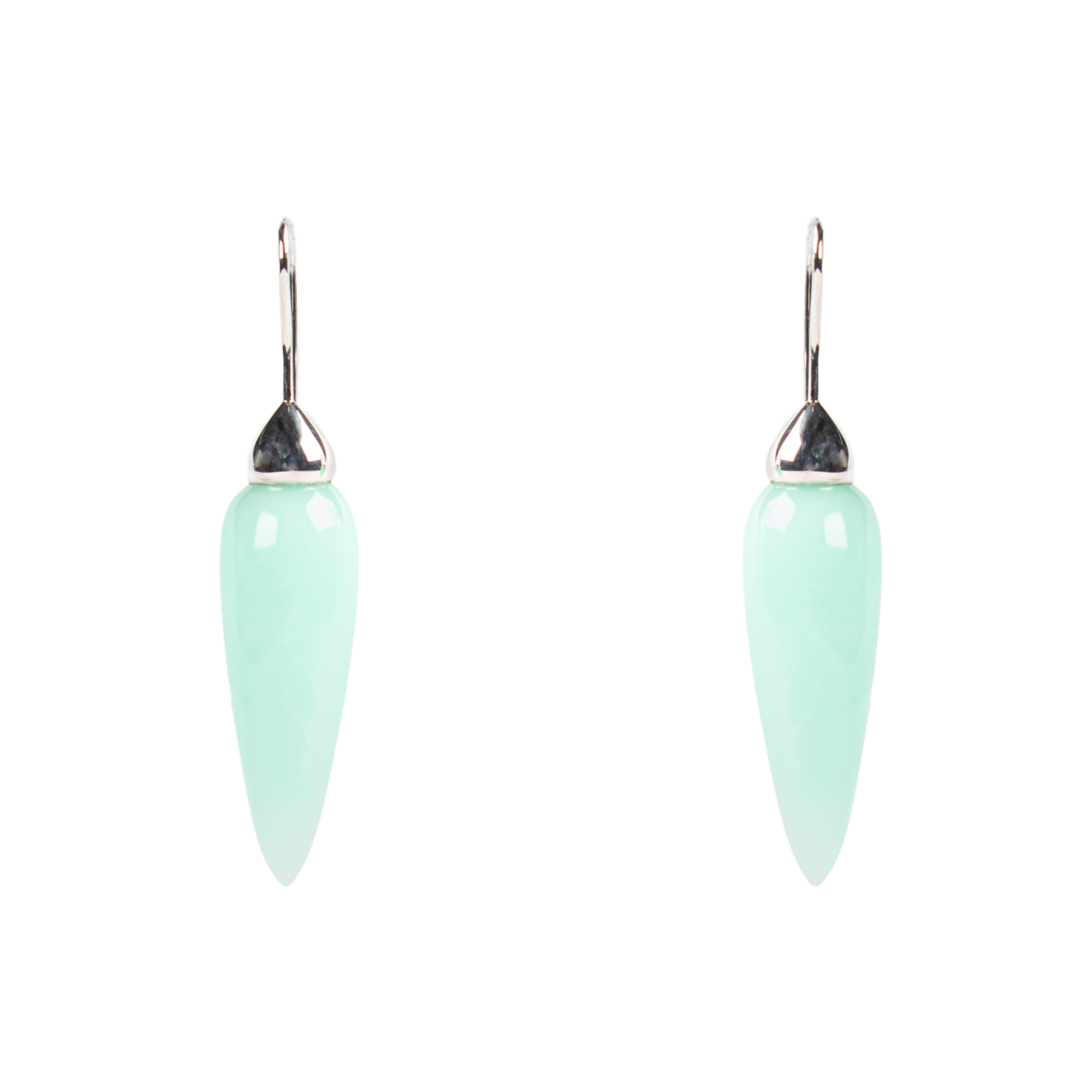 Ohrhänger aus 18 kt Weissgold mit zwei Chrysopraspampeln von 33 × 11,5 mm.