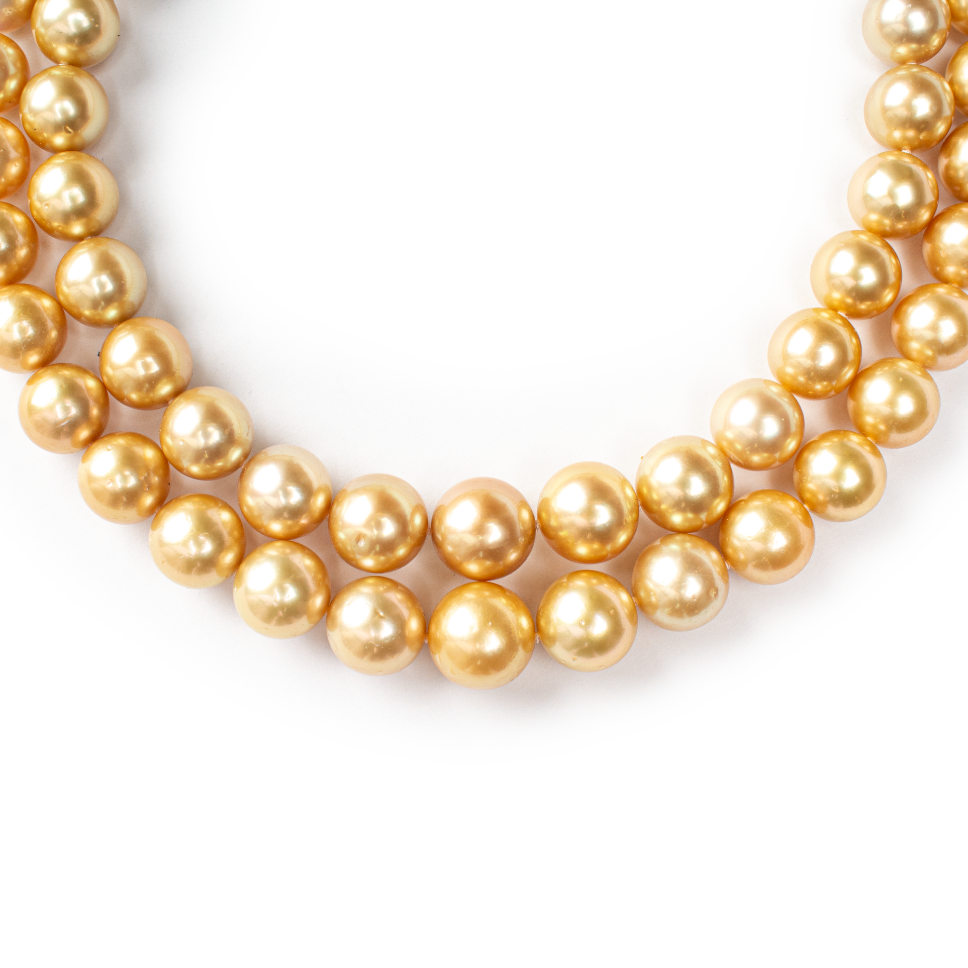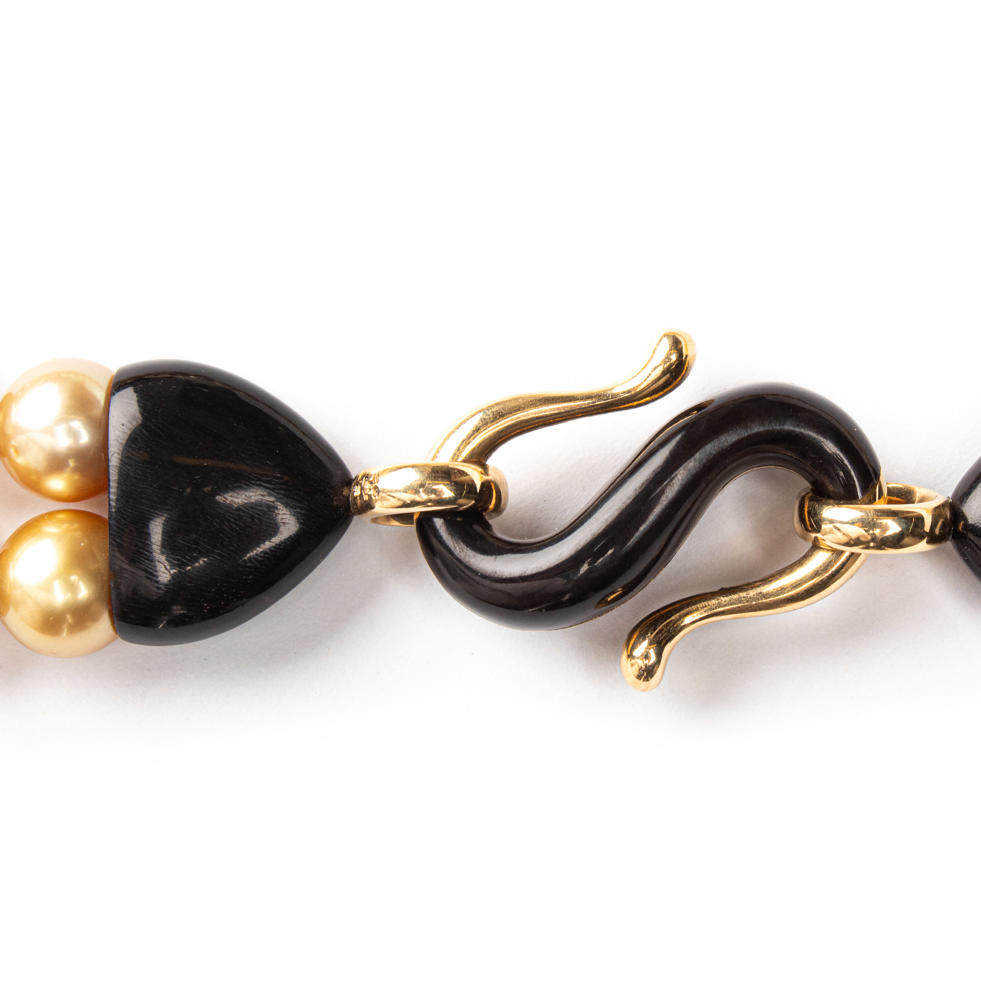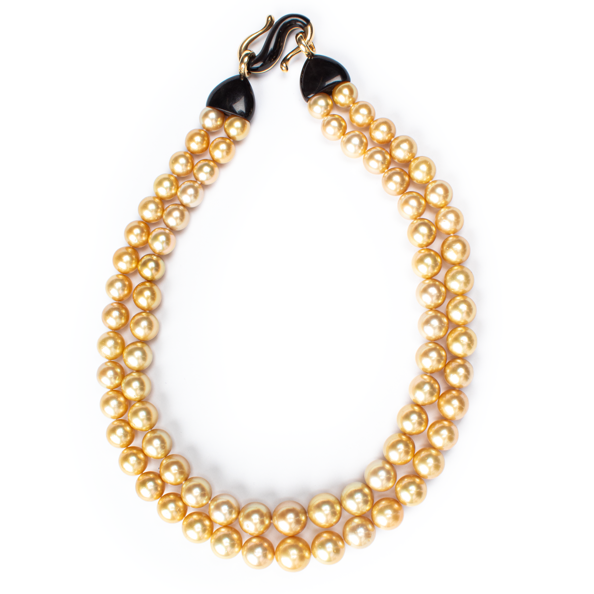 Collier aus Südseeperlen von 10–13,5 mm mit einem Verschluss aus 18 kt Gelbgold und Wasserbüffelhorn, zweireihig. Länge 47 cm.