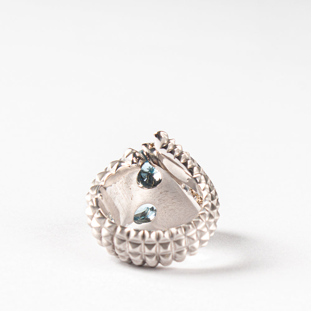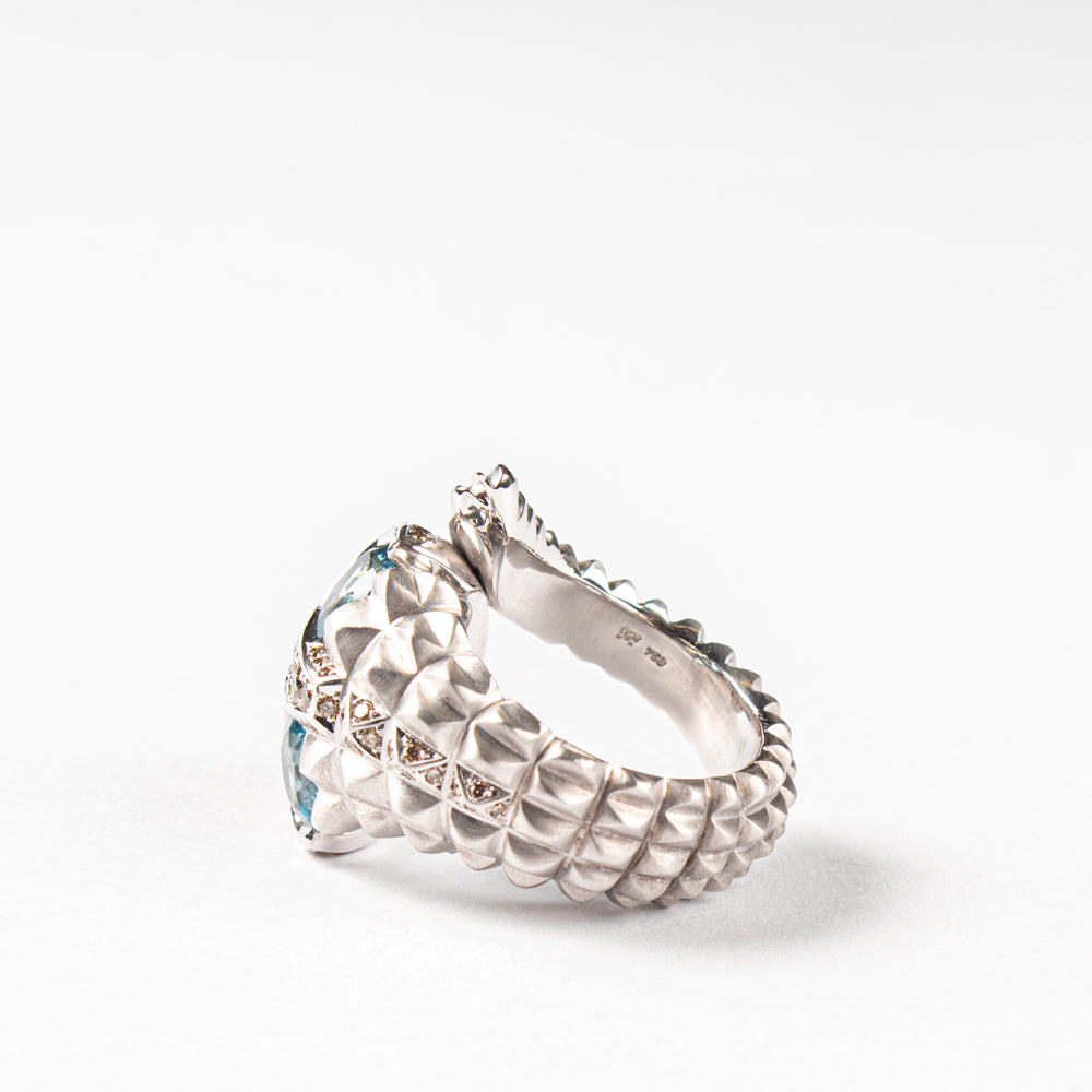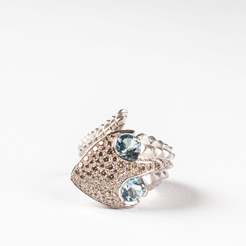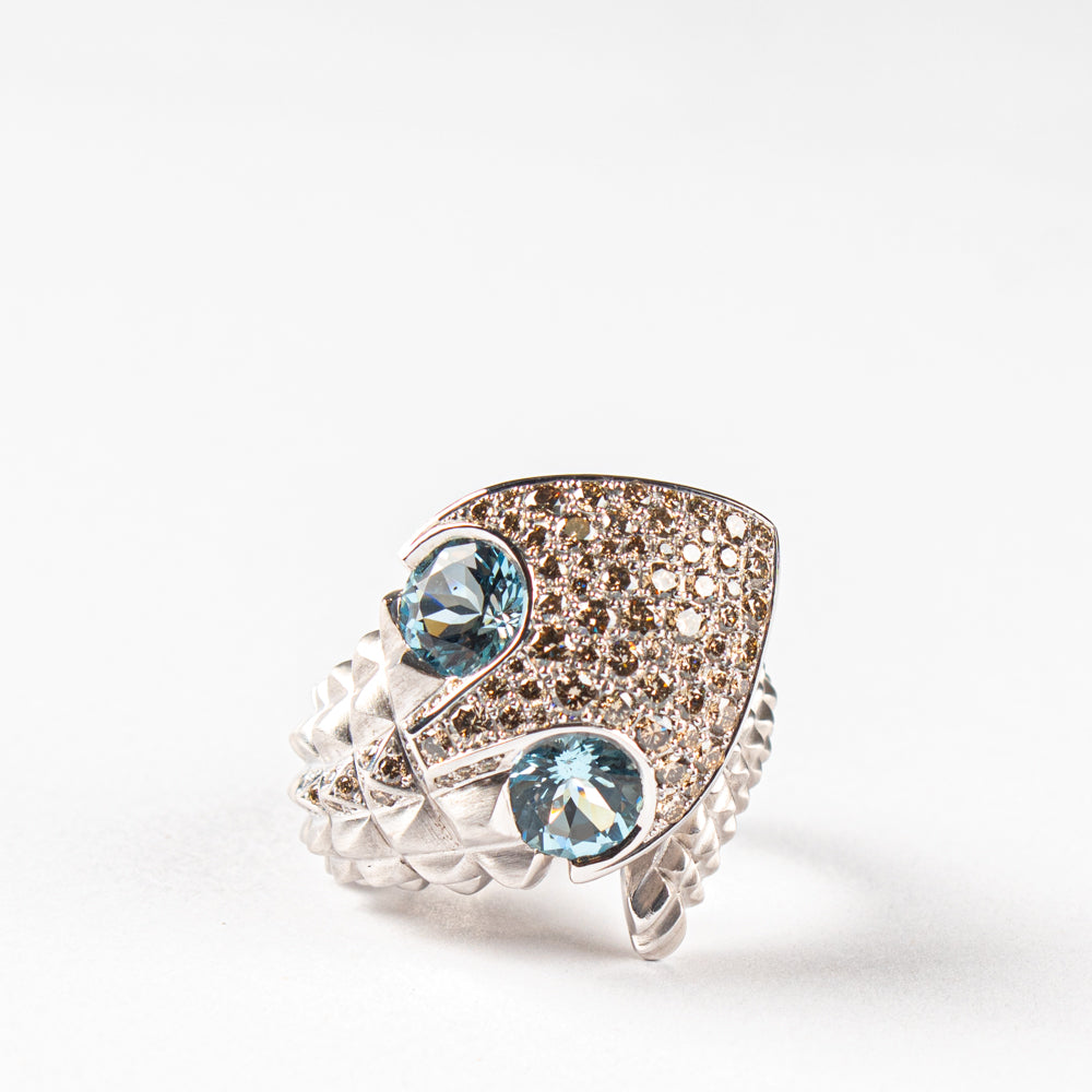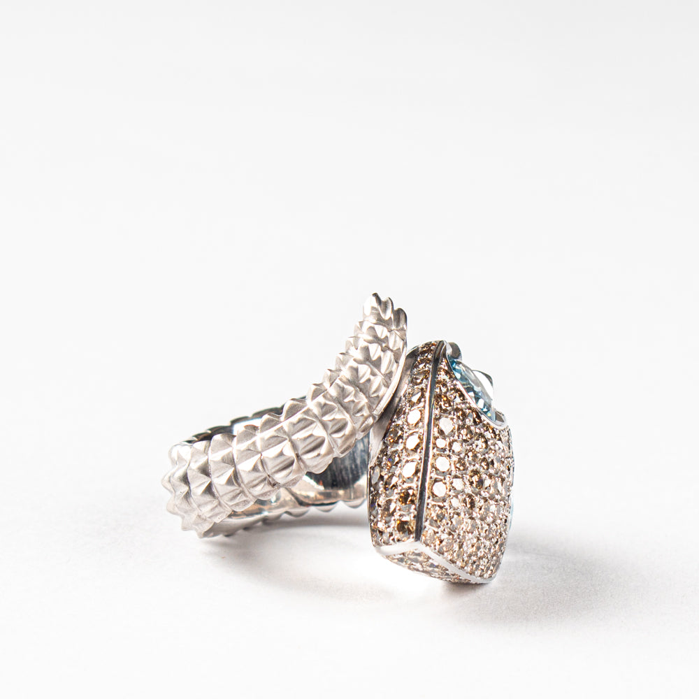 Echsenring aus 18 kt Weissgold mit zwei Aquamarinen von insgesamt 2,57 ct und 126 braunen Brillanten von insgesamt 2,47 ct. Grösse 56. Erhältlich in verschiedenen Goldfarben und in Platin. Die Augensteine können nach Kundenwunsch angepasst werden.
