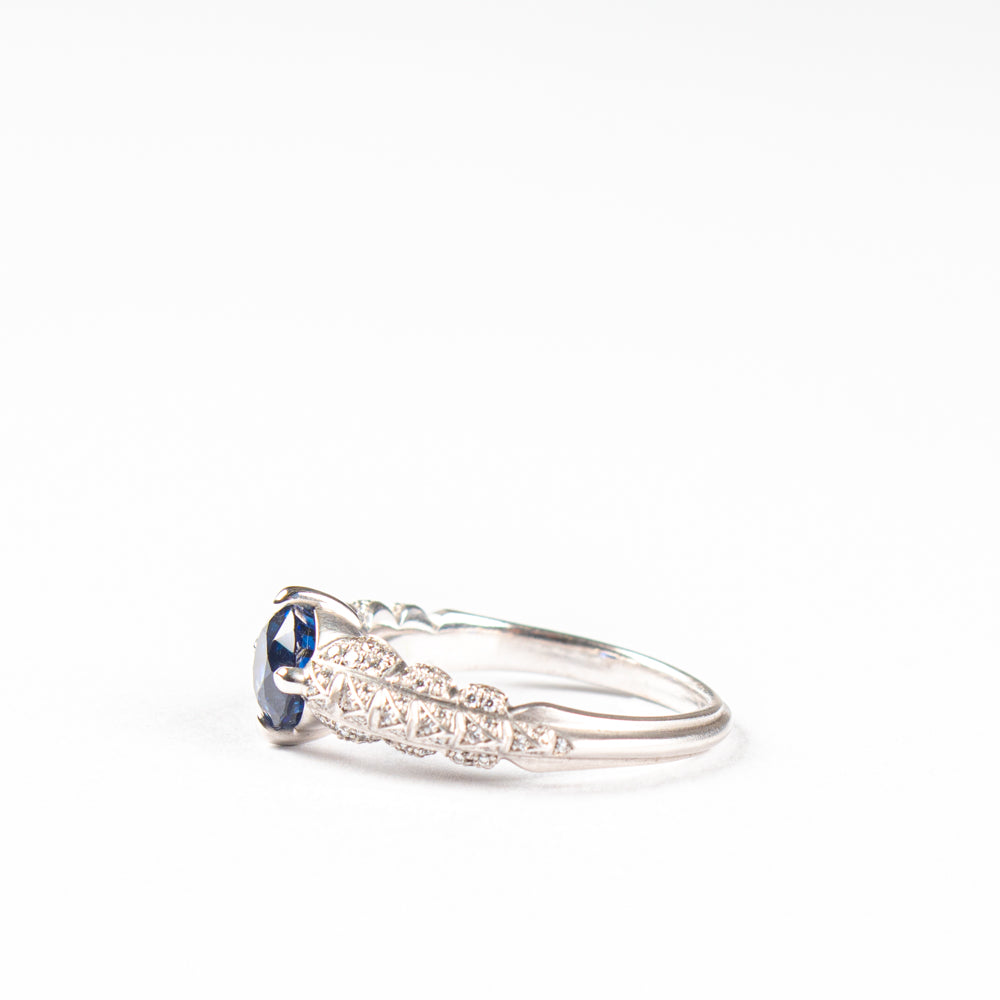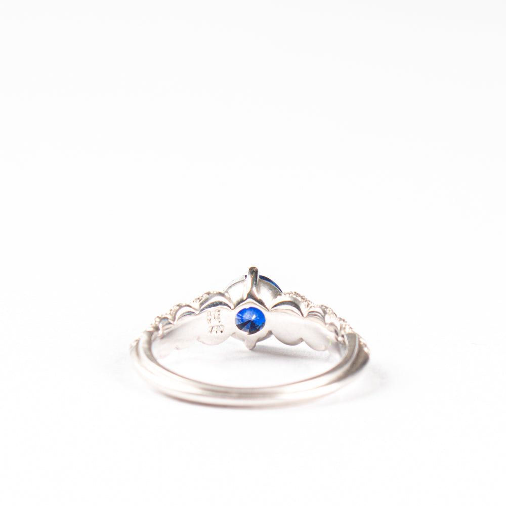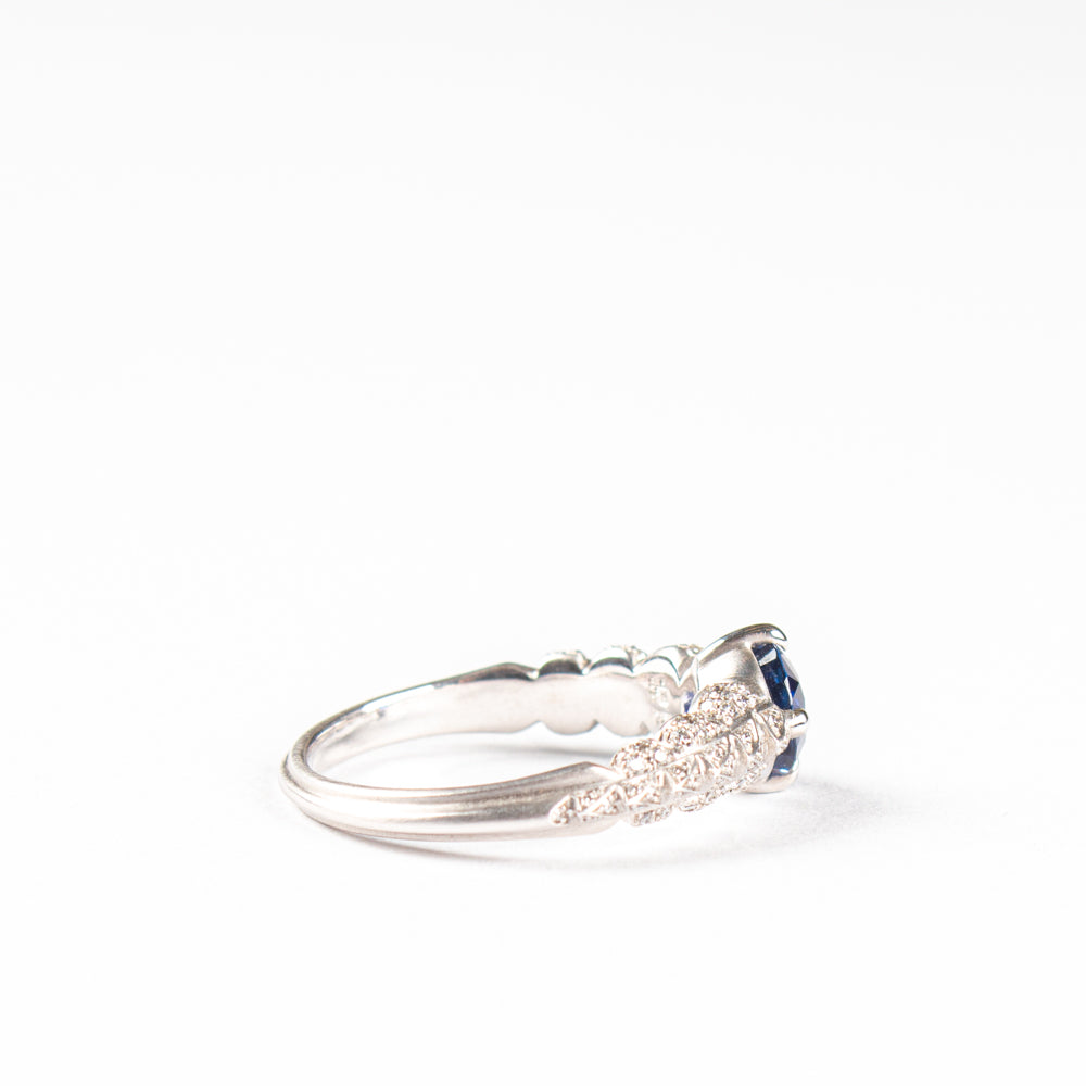 Ring aus 18 kt Weißgold mit einem blauen Saphir von 1,33 ct (heat) sowie 90 Brillanten (IF–VVS) von insgesamt 0,22 ct. Größe 52,5. Erhältlich in verschiedenen Goldfarben und in Platin. Der Mittelstein kann nach Kundenwunsch angepasst werden.