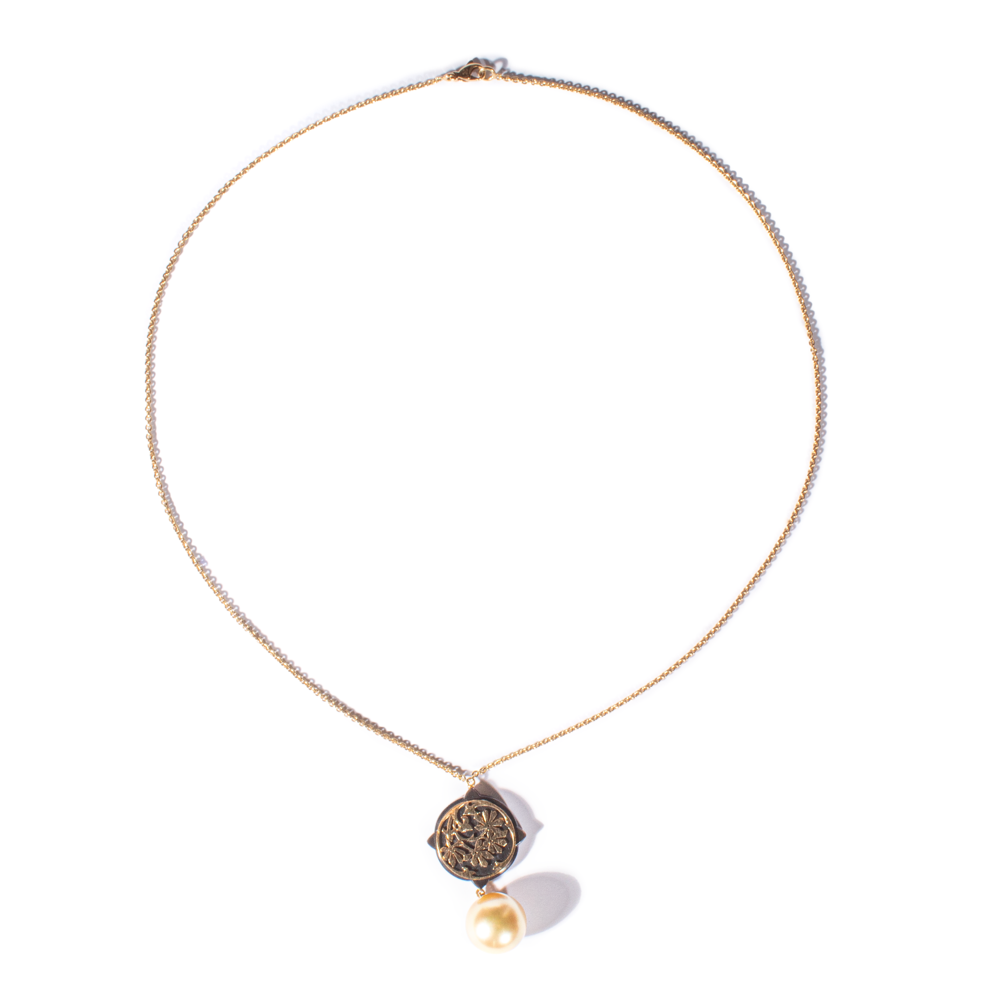 Anhänger aus Roségold 18 kt mit schwarzem Wasserbüffelhorn und einer goldfarbenen Südsee-Perle (15 mm). Ergänzt wird das Stück durch ein feines Ankerkettchen aus Roségold 18 kt (1.7 mm) in 52 cm Länge. Dieses Schmuckstück ist ein Einzelstück.