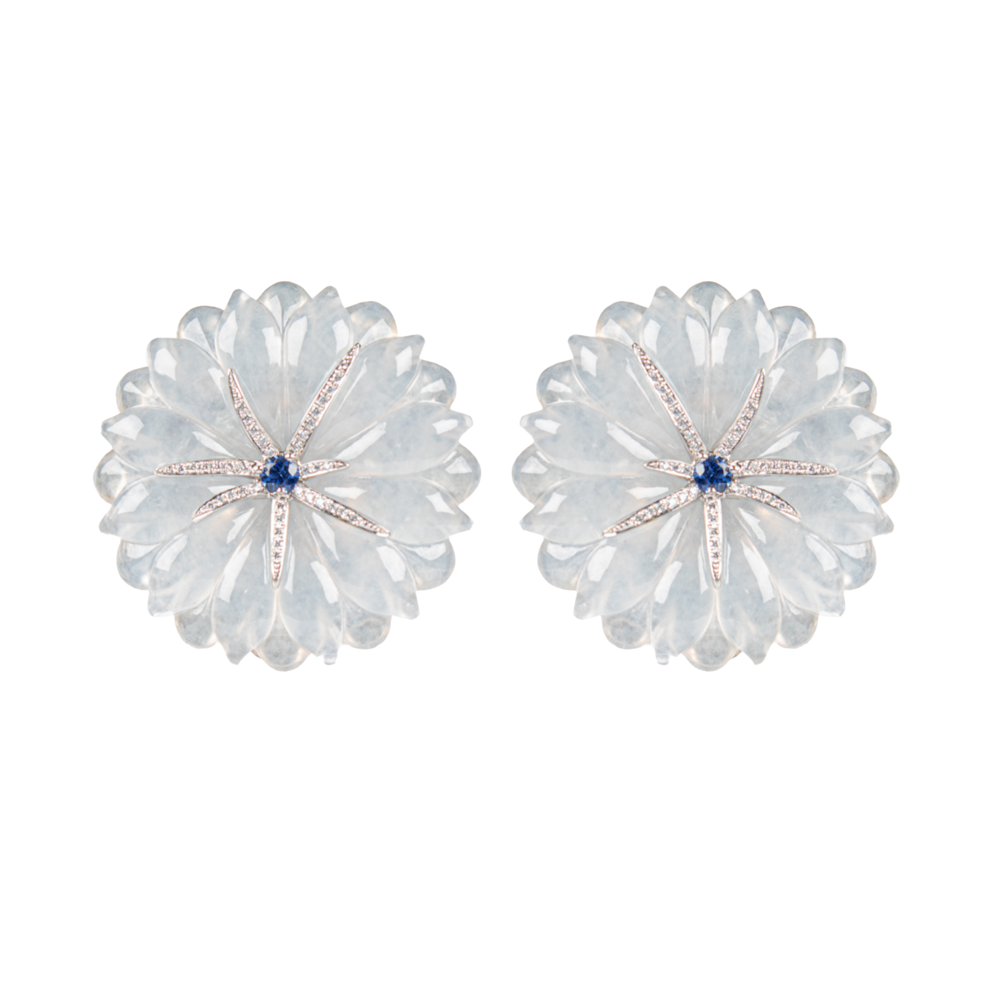 Ohrclip aus 18 kt Weissgold mit zwei gravierten weissen, transparenten Jadeblüten von 29 mm, zwei blauen Saphiren von insgesamt 0,20 ct sowie 71 Brillanten (G/G, vs) von insgesamt 0,16 ct.