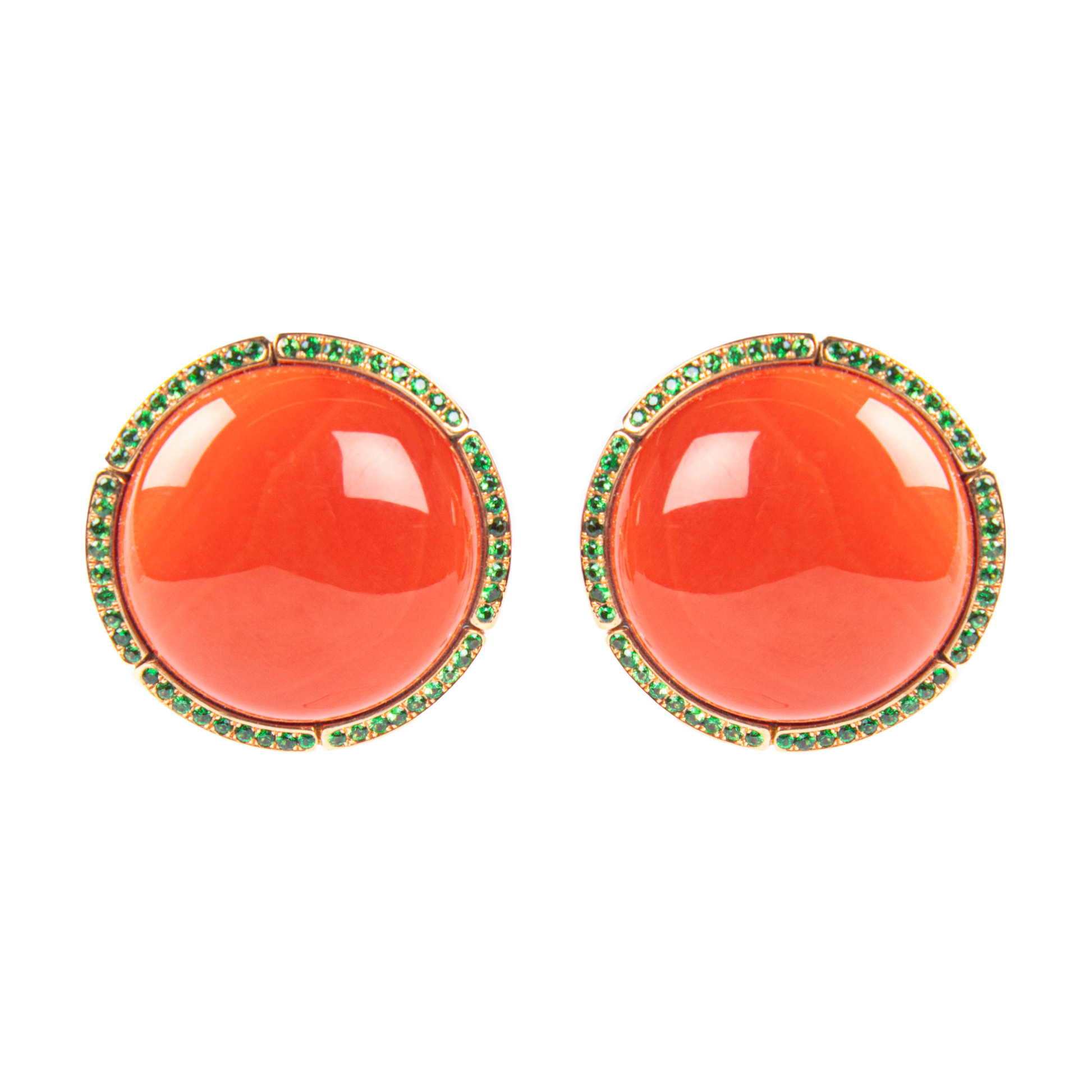 Ohrclip aus 18 kt Roségold mit zwei runden, dunkelorangenen Mittelmeer-Korallencabochons von 24,8 mm, 108 Tsavoriten von insgesamt 1,41 ct sowie Elementen aus schwarzem Wasserbüffelhorn. Einzelstück.