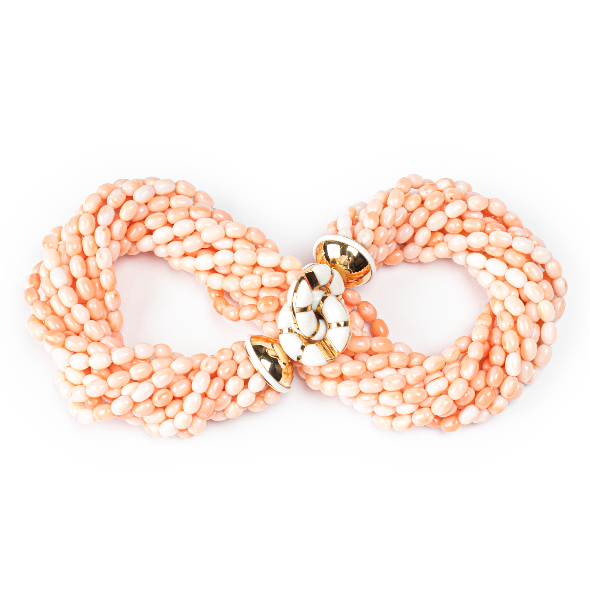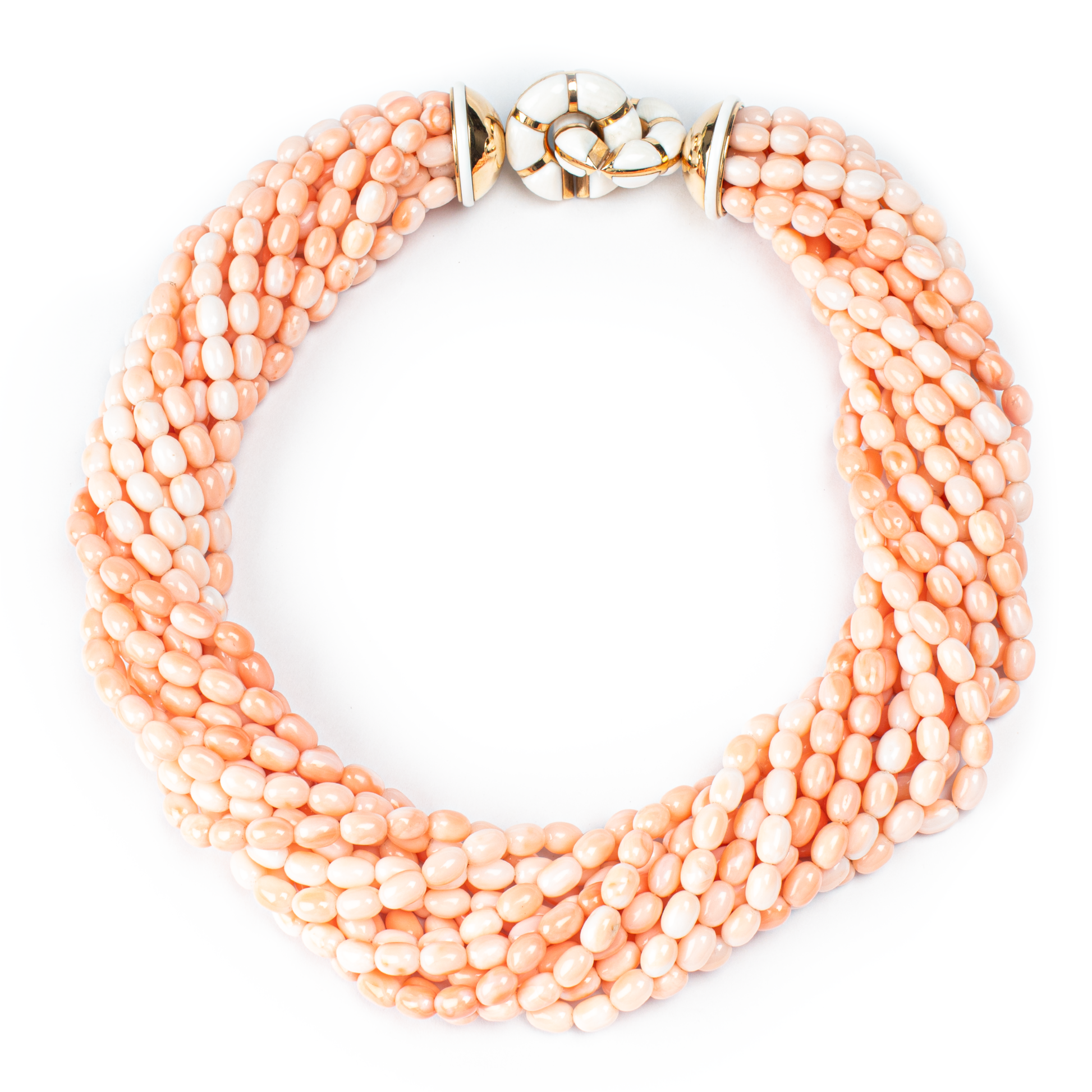 Collier aus 18 kt Roségold in Kombination mit weißem Mammut und einem zwölfreihigen Verlauf aus Korallen in Rosa- und Lachstönen. Länge 50 cm. Einzelstück.