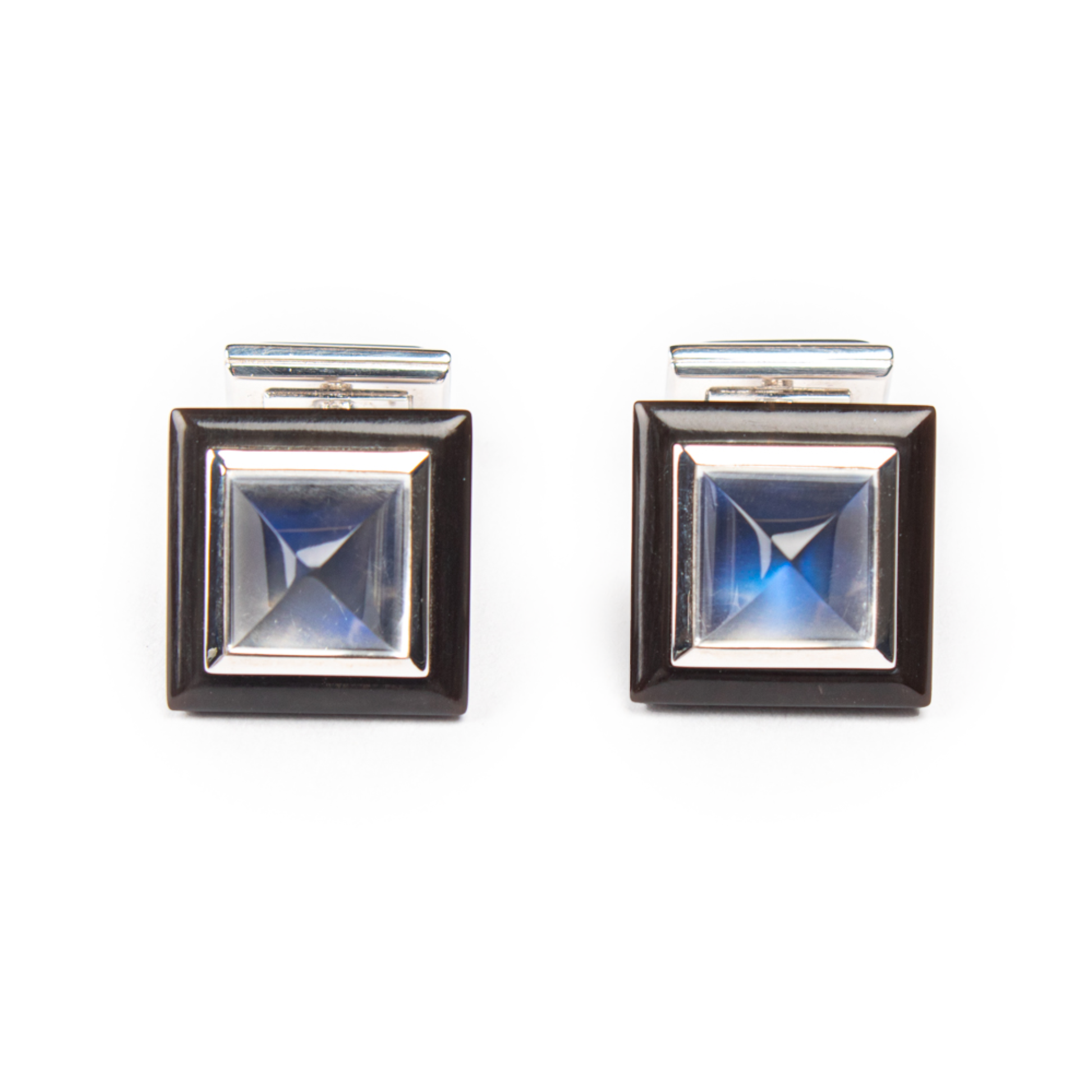 Manschettenknöpfe aus 18 kt Weissgold mit zwei blauen Mondsteincabochons von insgesamt 11,32 ct und Elementen aus Wasserbüffelhorn. Einzelstück.