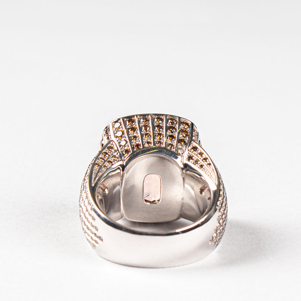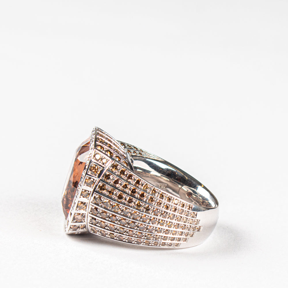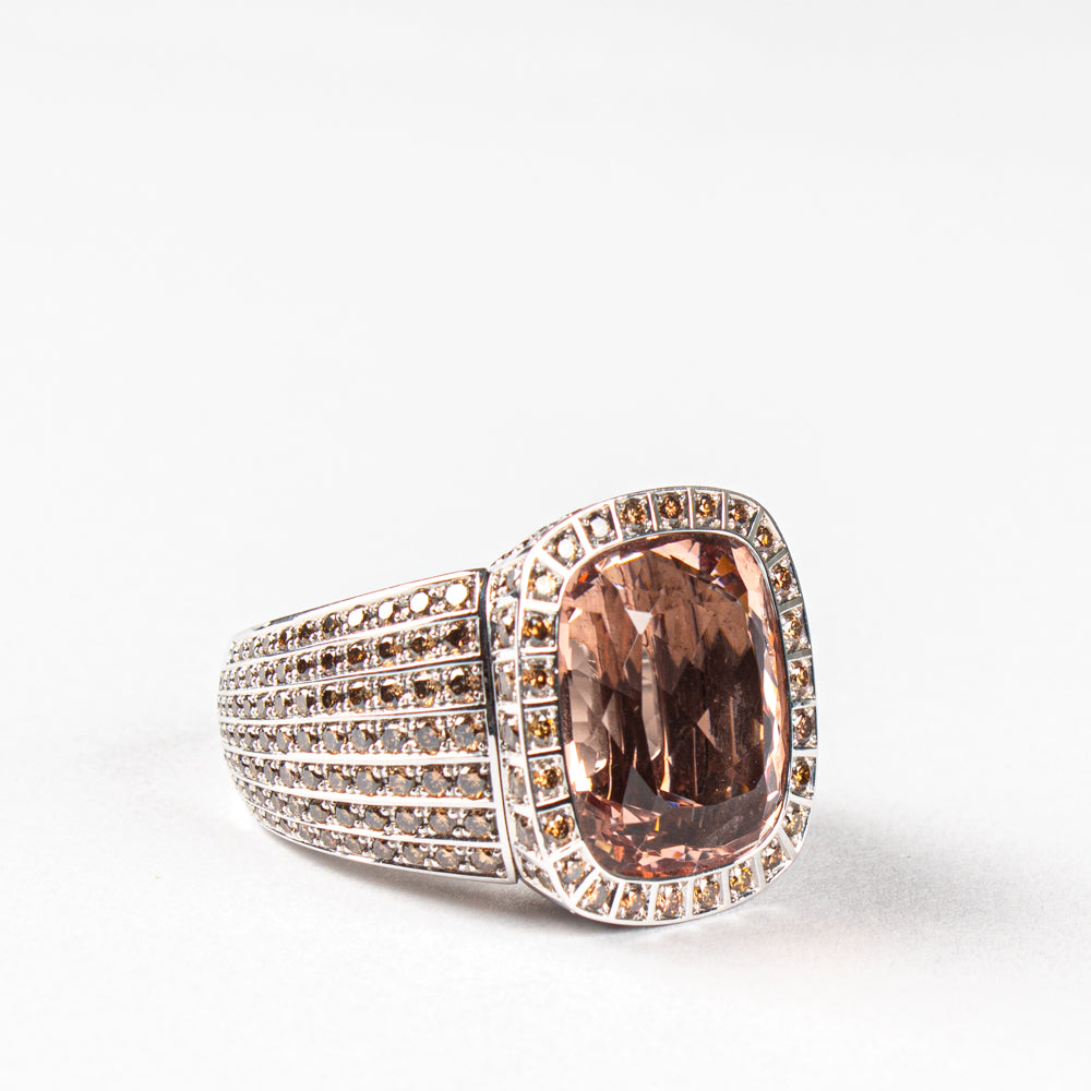 Ring aus 18 kt Weissgold mit einem antikeckigen Morganit von 17,21 ct sowie 292 braunen Brillanten von insgesamt 3,54 ct. Grösse 56. Einzelstück.