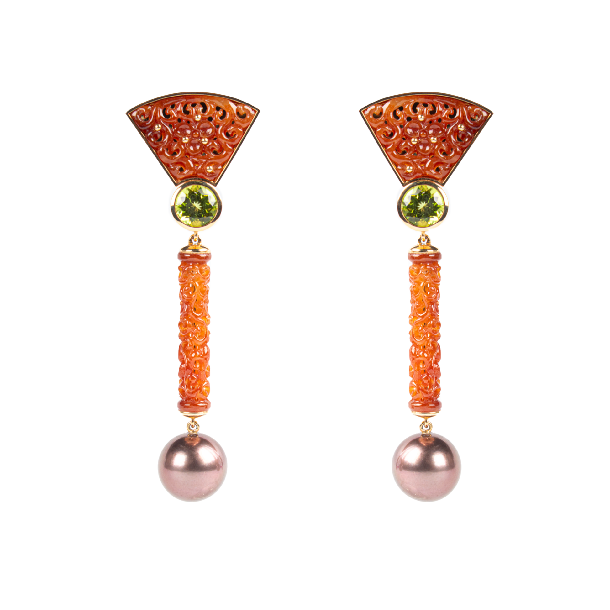 Ohrhänger aus 18 kt Roségold mit vier gravierten Jadeelementen in Orange/Braun, zwei grünen Peridoten von insgesamt 4,46 ct sowie zwei auberginefarbenen Perlen von 13,7 mm. Einzelstück.