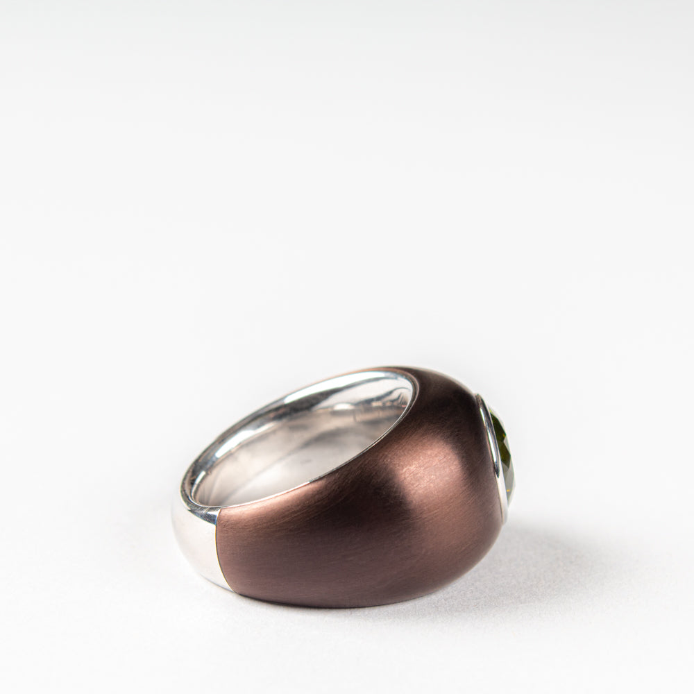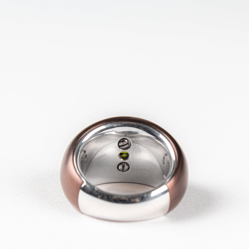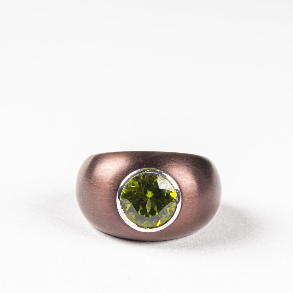 Ring aus Edelstahl und 18 kt Weißgold mit Keramikbeschichtung, besetzt mit einem grünen Peridot von 3,64 ct. Grösse 54.