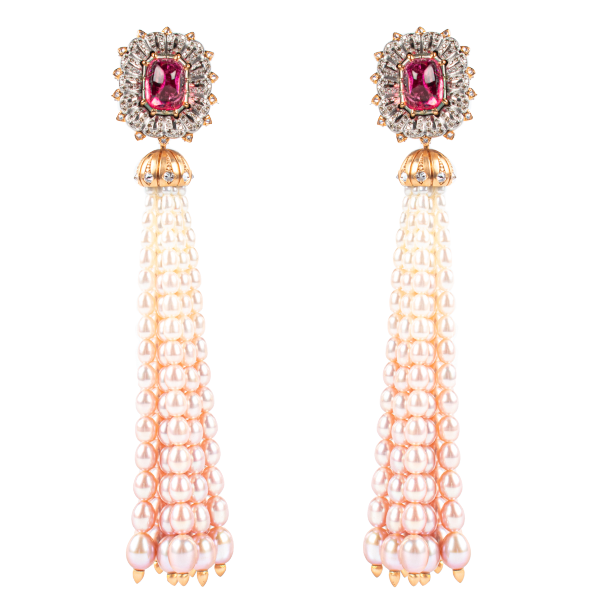 Ohrclip aus 18 kt Weiss- und Rotgold mit zwei pinkfarbenen Turmalincabochons von insgesamt 7,18 ct, 196 Brillanten (TW/vvs) von insgesamt 0,69 ct sowie 224 hellbraunen Brillanten von insgesamt 1,04 ct. Ergänzt durch Perlenhänger im Farbverlauf, 10-rangig, besetzt mit 16 Brillanten (F/G, vvs) von insgesamt 0,41 ct. Die Perlenhänger können ein- und ausgehängt werden.