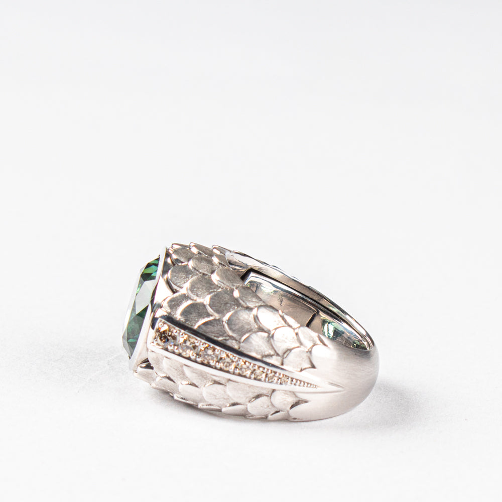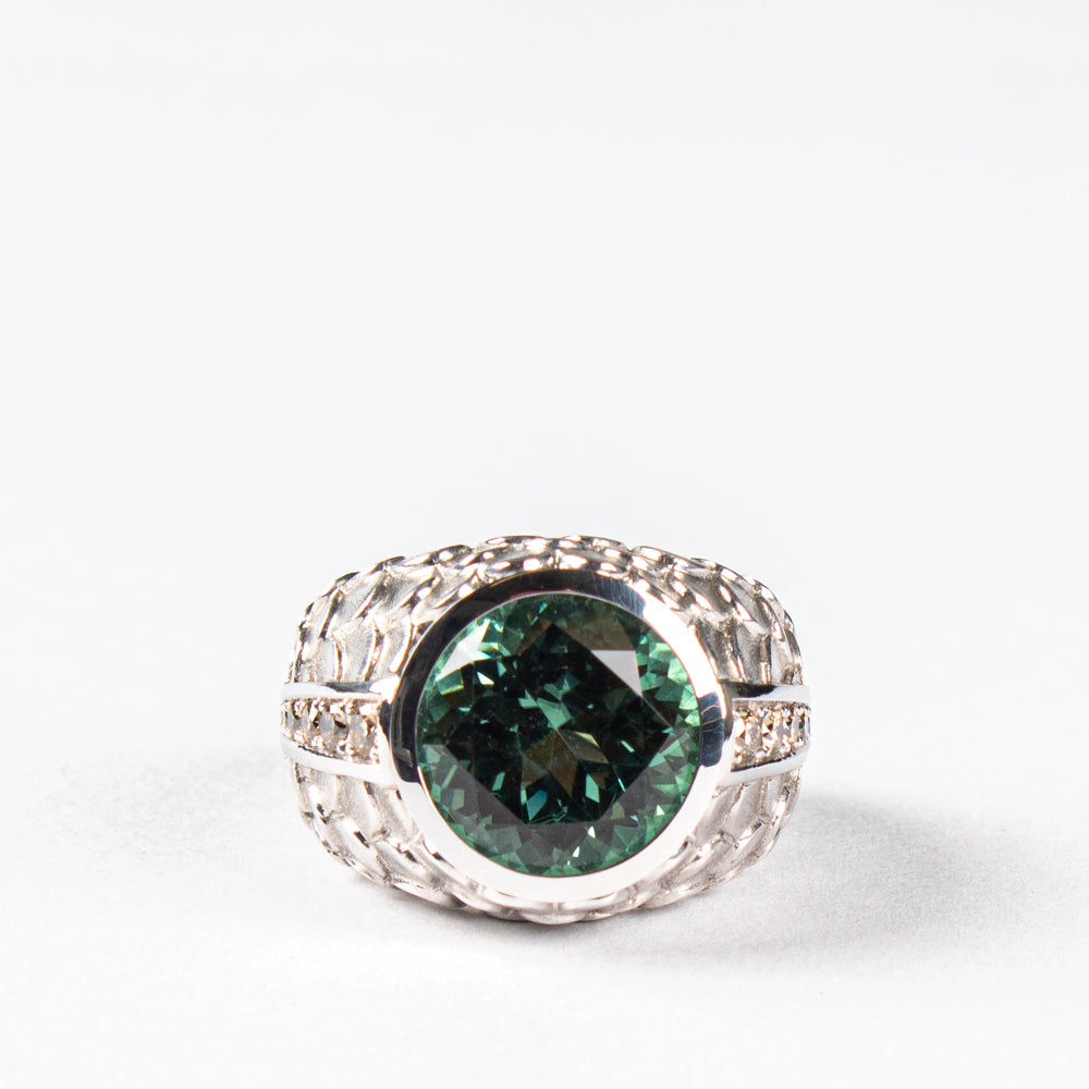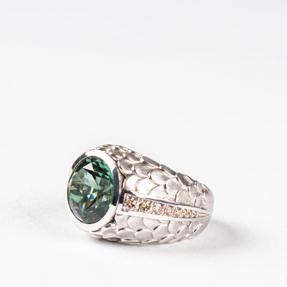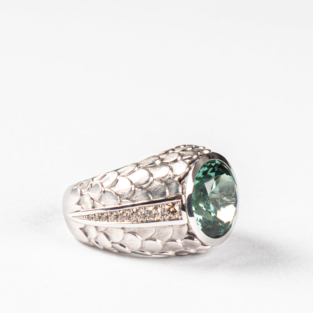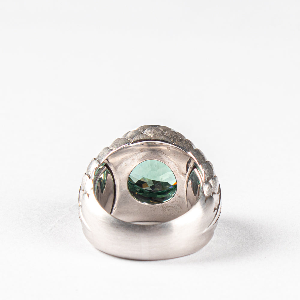 Ring aus 18 kt Weissgold mit einem Turmalin von 7,33 ct und seitlich 16 Brillanten (light brown) von insgesamt 0.42 ct. Grösse 54. Einzelstück.