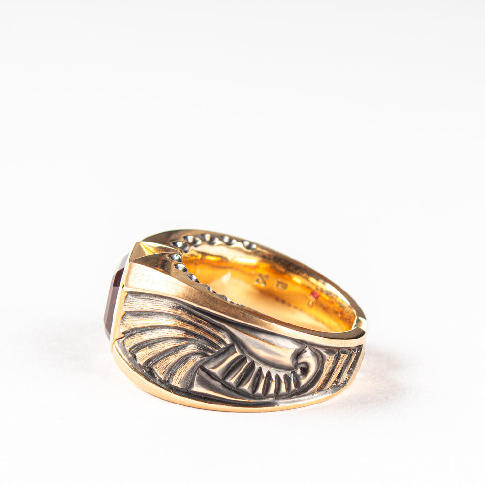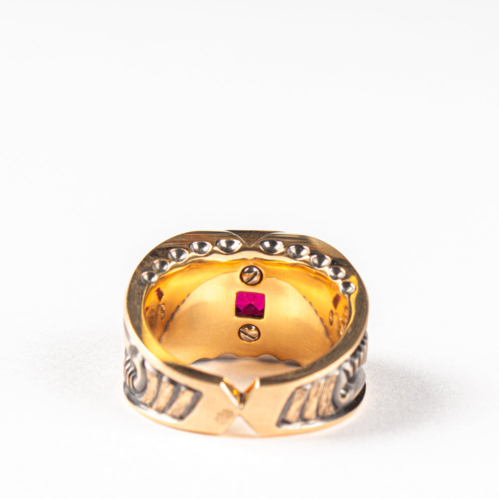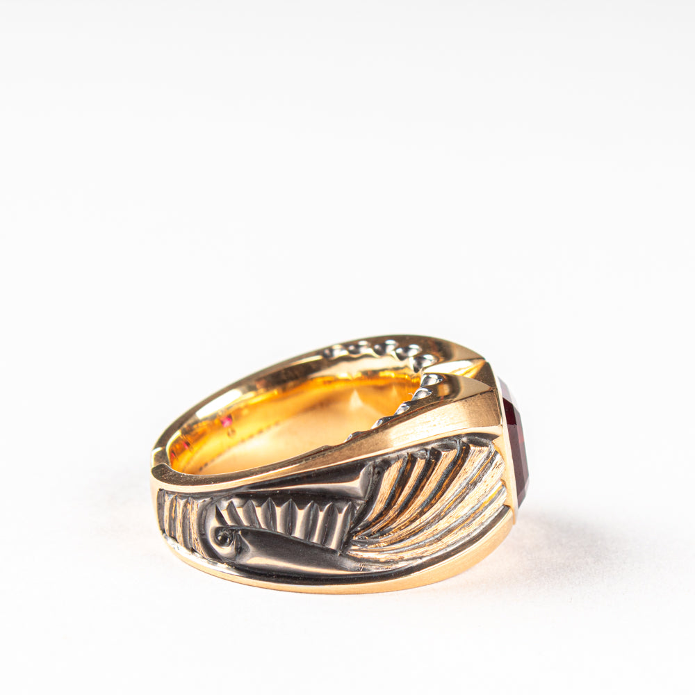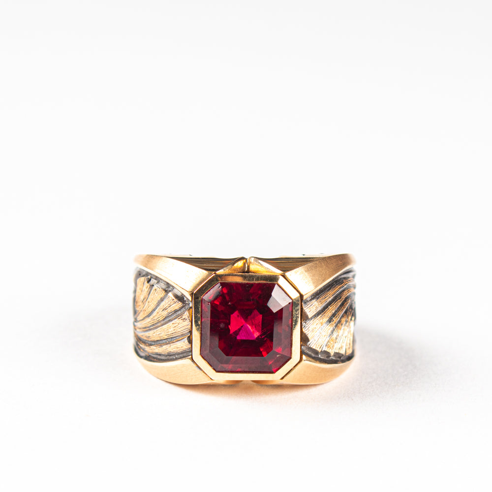 Ring aus 18 kt Roségold, teilweise schwarz rhodiniert. Mit einem achteckigen roten Turmalin von 4,14 ct. Grösse 59. Einzelstück.