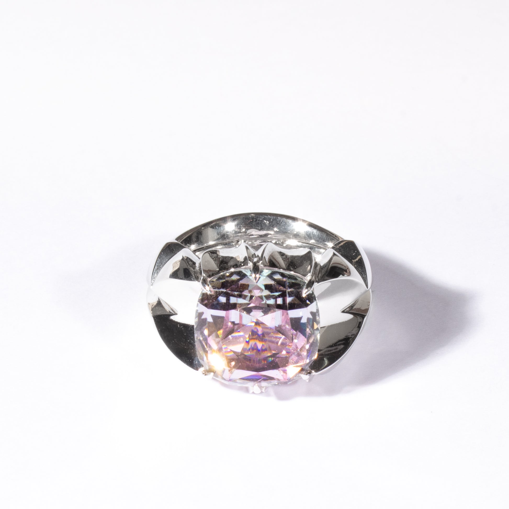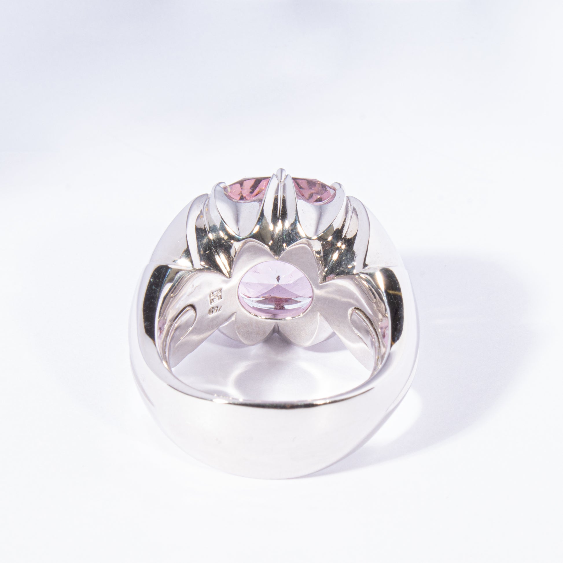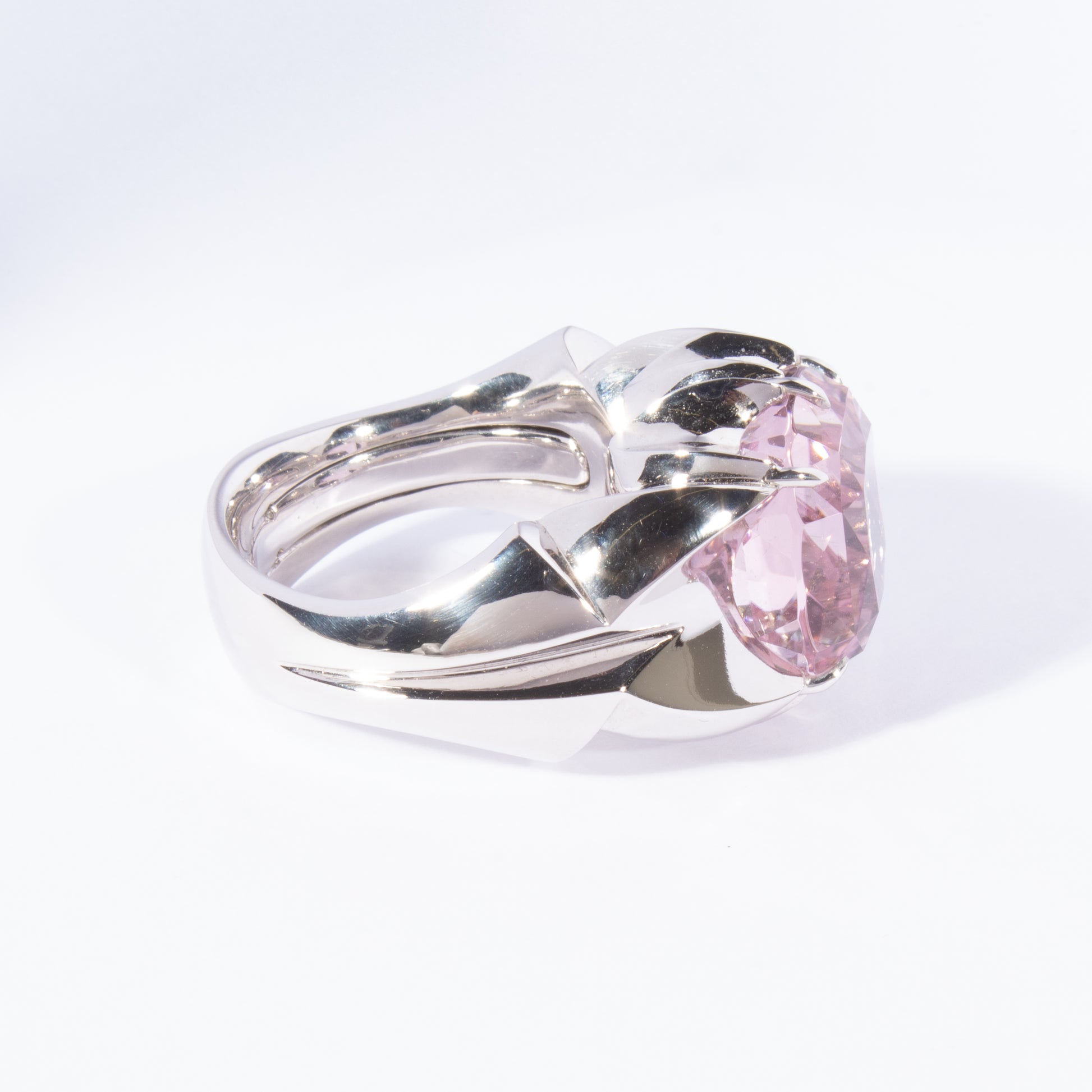Einzigartiger Ring in 18 Karat Weissgold, besetzt mit einem antikeckig geschliffenen Turmalin in zarten Rosa- und Hellblautönen (12.76 ct). Grösse 56.5.