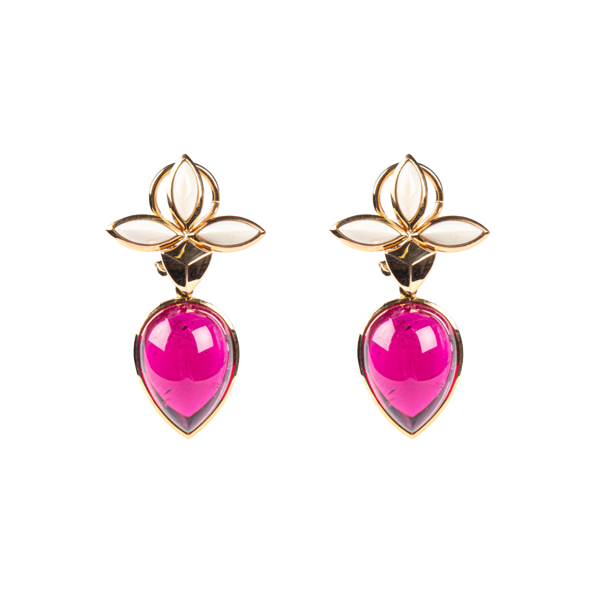Ohrclip aus 18 kt Roségold mit zwei rubellitfarbenen Turmalin-Tropfencabochons von insgesamt 33,97 ct sowie sechs Mammut-Navettencabochons.