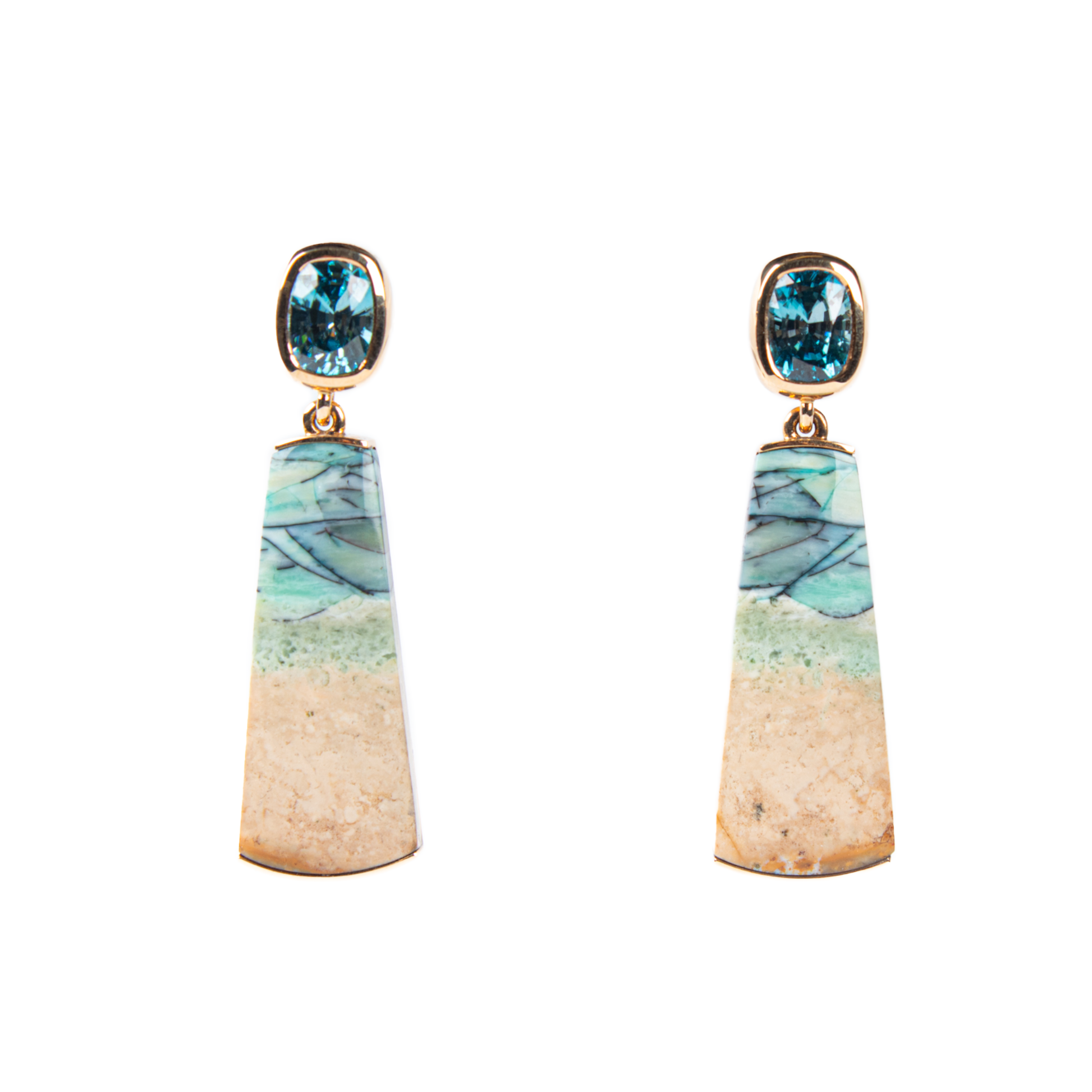 Ohrhänger aus 18 kt Roségold mit zwei antikeckigen blauen Zirkonen von insgesamt 7,21 ct sowie zwei Pampeln aus opalisiertem Holz (Indonesien). Einzelstück.